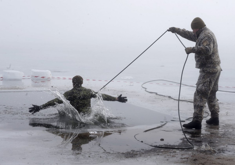 Một người lính Canada tại Latvia tham gia vào chương trình huấn luyện trong hỗ băng sụt vỡ, một phần trong chiến dịch huấn luyệnOperation Atlantic Resolvecủa NATO .