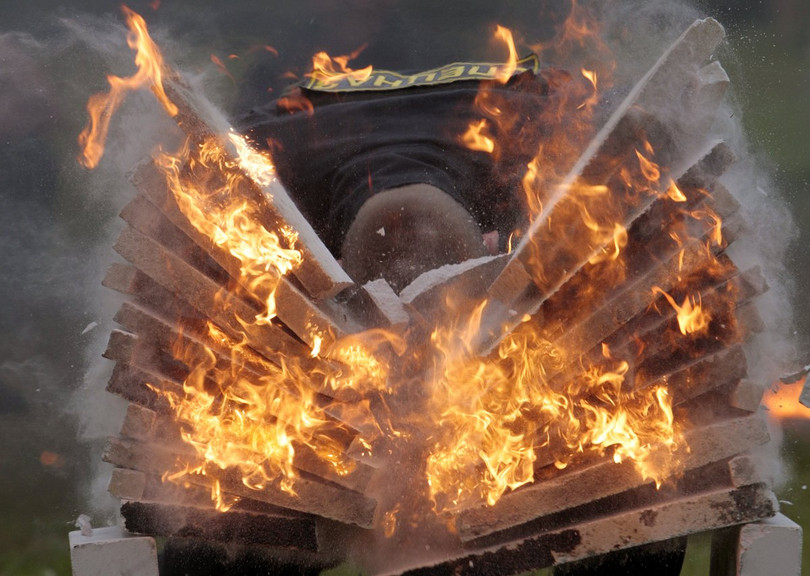 Chiến binh Mũ nồi đỏ phải có những năng lực đặc biệt, một quân nhân RedBeret thể hiện khả năng công phá bằng đầu những miếng bê tông rực lửa.