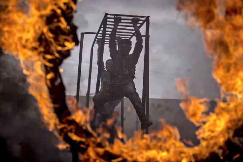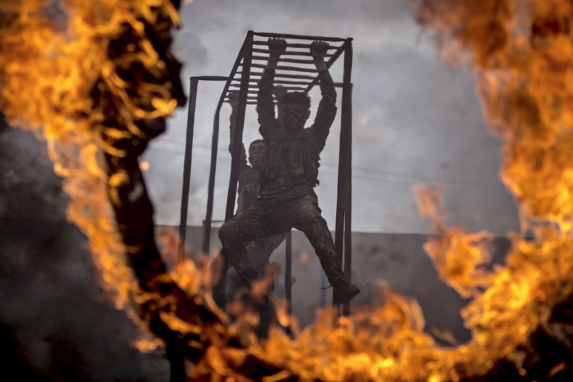 Ở Syria, các binh sĩ người Kurd thuộc YPG thực hành huấn luyện vượt cầu khỉ và chướng ngại vật lửa cháy.
