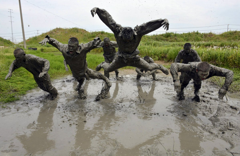 Ở Trung Quốc, lực lượng cảnh sát vũ trang phải đối mặt với một chế độ rèn luyện đáng sợ. Trong ảnh là các cảnh sát viên tham gia vào một buổi huấn luyện trong bùn lầy.