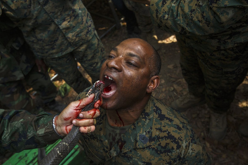 Lính thủy đánh bộ Mỹ cũng tham gia các chương trình diễn tập cùng đối tác của họ ở Thái Lan, trong một môi trường khí hậu khắc nghiệp, trong ảnh, các binh sĩ LTĐB Mỹ uống máu rắn hổ mang trong chương trình huấn luyện kỹ năng sống còn ở vùng rừng rậm nhiệt đới.