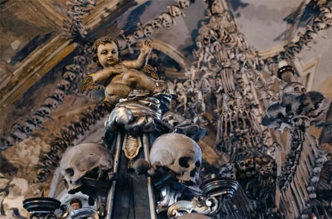 Trong khi ở trong nhà thờ, bẹn nên kiểm tra đèn chùm xương đáng kinh ngạc treo trên trần nhà, cũng như áo giáp Schwarzenberg - đầu của một chiếc Turk bị cắt đứt, bị một con quạ mổ còn lại xương.