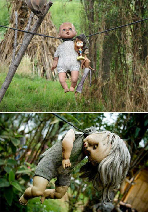 Theo truyền thuyết, một cô bé bị chết đuối ở hòn đảo này. Sau đó, cha cô tìm thấy một con búp bê gần nơi xảy ra bi kịch. Ông cho rằng linh hồn của cô gái đã nhập vào con búp bê, vì vậy ông treo nó lên một cái cây gần đó. Sau này, ông ta thu thập những con búp bê bị bỏ rơi và đưa chúng đến hòn đảo. Thậm chí ông còn rời bỏ gia đình để sống ở nơi ám ảnh này.