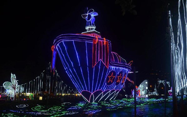 Đèn Giáng sinh cầu kỳ hình chiếc thuyền được trưng bày trên sông Medellin, Colombia.