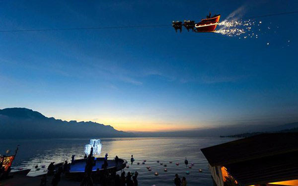 Ông già Noel ngồi trên chiếc xe tuần lộc chạy bằng cáp treo vẫy chào với khách thăm quan ở hồ Geneva, Thụy Sĩ.