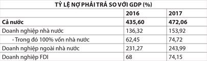 | Nợ của nền kinh tế là đáng lo Tính toán từ số liệu trong Sách trắng doanh nghiệp Việt Nam 2019 cho thấy đến năm 2017 nợ phải trả của doanh nghiệp, bao gồm doanh nghiệp nhà nước, ngoài nhà nước và doanh nghiệp có vốn đầu tư nước ngoài (FDI) là 23,6 triệu tỉ đồng, trong khi tổng sản phẩm trong nước (GDP) theo giá hiện hành năm 2017 là 5 triệu tỉ đồng. Như vậy, nợ phải trả so với GDP là 472%.