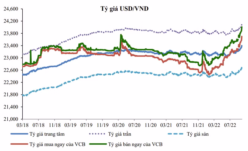 Ngày 30/9/2022, NHNN đã điều chỉnh giá bán ngoại tệ từ 23.700 VND/USD lên 23.925 VND/USD. Tỷ giá giao dịch tại các NHTM từ đầu năm 2022 tới ngày 3/10 tăng 1.1220 VND đạt 24.030-24.040 VND/USD, tương ứng VND đã giảm giá khoảng 4,88% so với đồng USD. Dù vậy, đây vẫn là mức giảm giá tương đối thấp so với nhiều đồng tiền khác so với USD.