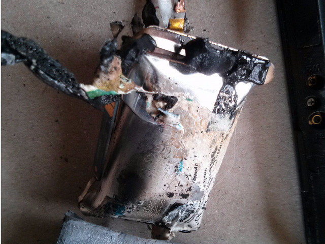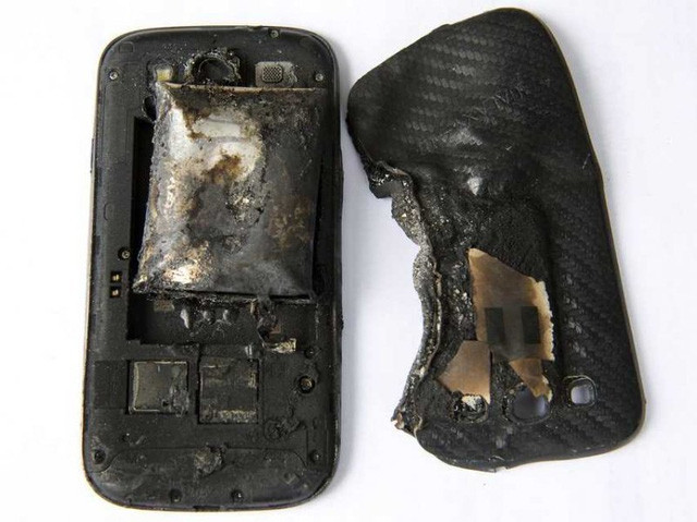 Còn đây là chiếc Samsung Galaxy S3 sau khi cục pin bên trong phát nổ. Người phụ nữ Thụy Sĩ là chủ nhân của chiếc smartphone này đã thay một viên pin mới không rõ nguồn gốc.