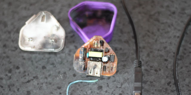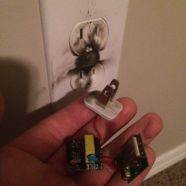 Anh chàng này cho biết sau khi cắm bộ sạc pin mới mua vào ổ điện, anh nghe thấy những tiếng nổ tách tách và sau đó là cháy xém. Rất may là nó đã không phát nổ và gây hỏa hoạn.