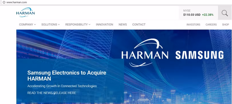 Trang chủ của Harman tràn ngập thông tin về thương vụ với Samsung (Ảnh chụp màn hình)