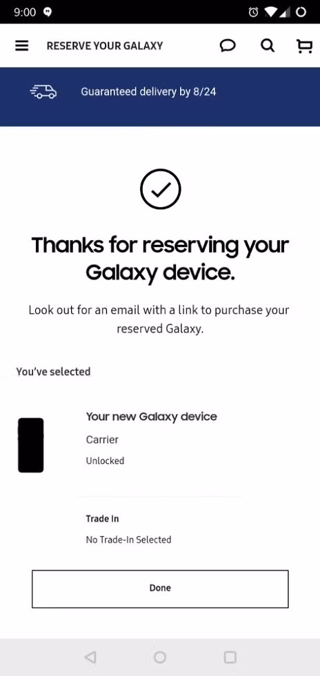 Khi bạn đặt trước, bạn có thể chọn nhà cung cấp dịch vụ bạn muốn sử dụng hoặc bạn có thể chọn máy Note 9 bản unlock. Không có lựa chọn màu sắc hoặc tùy chọn lưu trữ trong ứng dụng đặt trước này, vì những lựa chọn đó sẽ chỉ đến khi đơn đặt mua trước thực sự bắt đầu.