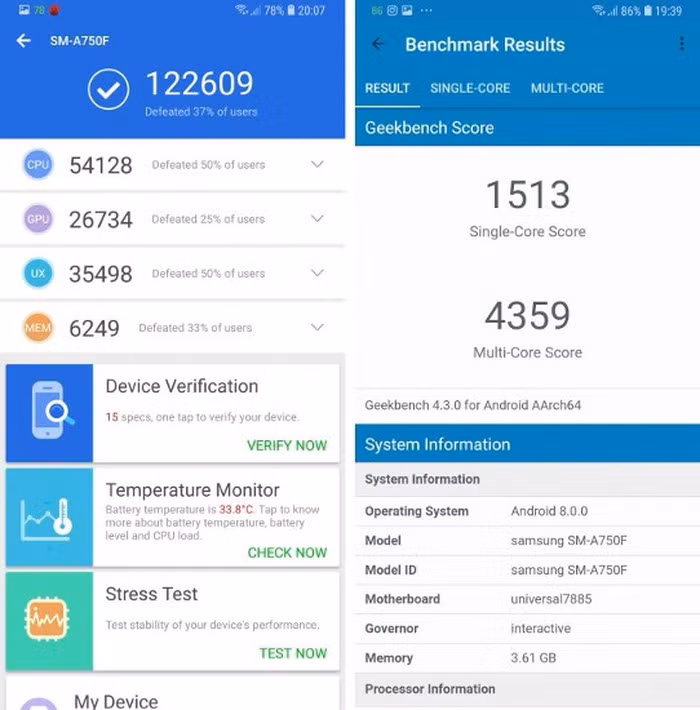 Kiểm tra cho thấy, điểm số mà Galaxy A7 2018 ghi được khá phù hợp với những gì người dùng có thể mong đợi từ một thiết bị trong phân khúc giá. Máy ghi được 122.609 điểm trên AnTuTu.
