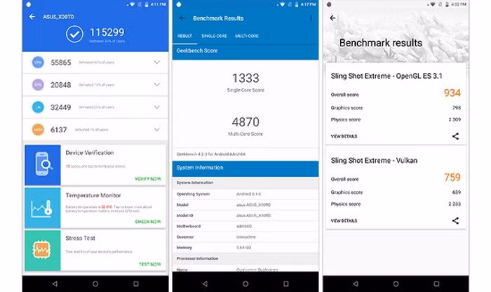 Để có được đánh giá chính xác hơn về hiệu năng của bộ vi xử lý, trước tiên chạy kiểm tra các bài benchmark thông thường trên thiết bị, bao gồm AnTuTu, Geekbench 4 và 3DMark.