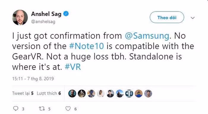 Ngay sau khi ra mắt chiếc Galaxy Note 10, Samsung cũng đã đưa ra thông tin chiếc smartphone này sẽ không tương thích với bộ Gear VR, một bộ headset thực tế ảo của Samsung chỉ hoạt động khi đặt một chiếc smartphone vào phía trước phần ống kính. Thông tin này được xác nhận theo một đoạn tweet của nhà phân tích công nghệ Anshel Sag. Quyết định dừng việc hỗ trợ kết nối với bộ headset của chiếc điện thoại flagship mới và Gear VR, hai sản phẩm đều của Samsung đã tạo nên nhiều hoài nghi về tương lai của thiết bị VR kết nối với smartphone này. Đồng thời các thiết bị VR độc lập với màn hình lắp đặt sẵn như Oculus Go đang trên đà phát triển mạnh mẽ.