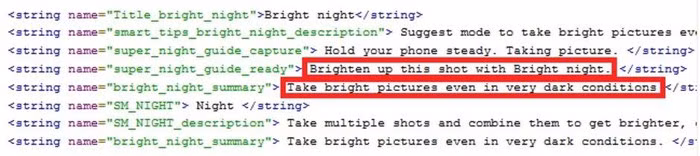 Bằng chứng đến từ đoạn mã mà XDA khám phá trong phiên bản thử nghiệm OneUI/Android Pie mới nhất dành cho Galaxy Note 9. Mã nhắc đến cái tên Bright Night và gồm các bình luận như Tăng sáng bức ảnh này với Bright Night, Chụp ảnh sáng ngay cả trong điều kiện rất tối, Chụp nhiều ảnh và kết hợp lại để có ảnh sáng hơn, rõ hơn khi thiếu sáng mà không dùng flash.