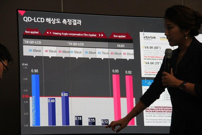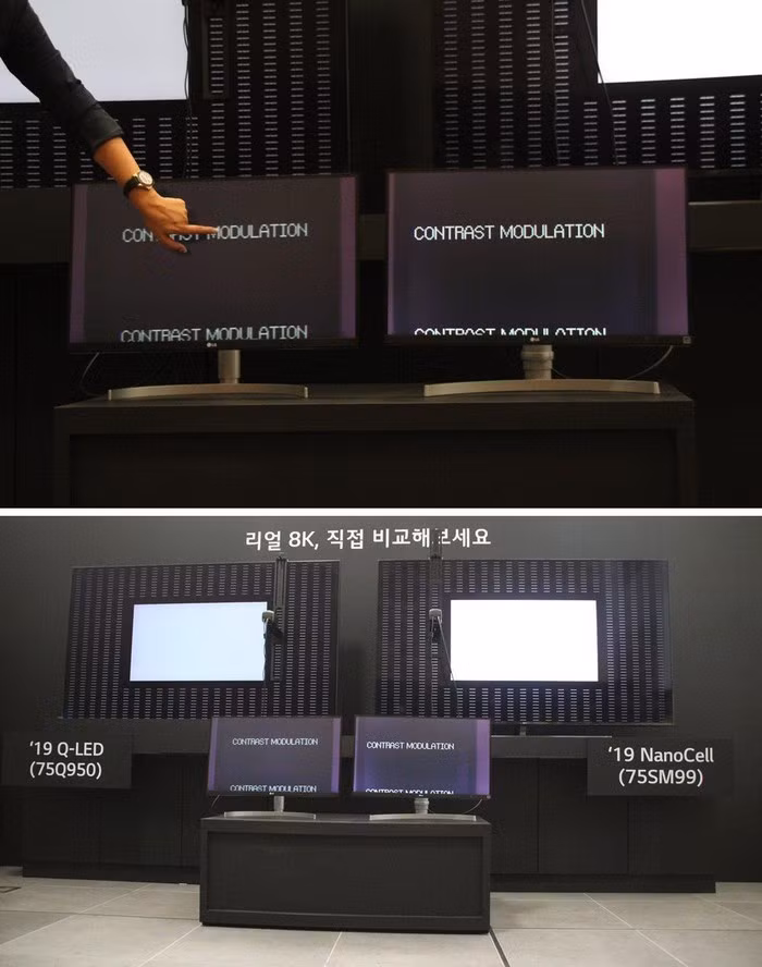 Theo LG, tivi Samsung sản xuất năm 2019 chỉ đạt chất lượng 4K vì không thể hiện sự phân biệt rõ ràng giữa màu trắng và màu đen. Một báo cáo của hiệp hội khoa học kỹ thuật VDE hồi tháng 6/2019 cho thấy tivi QLED 8K 75 inch của Samsung chỉ có giá trị CM 13% còn tivi NanoCell 8K 75 inch của LG là 90%.