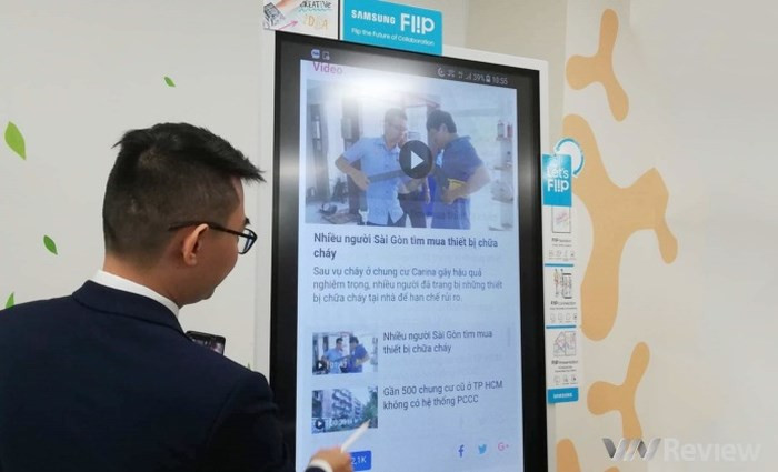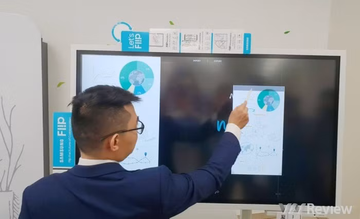 Samsung Flip WM55H hỗ trợ tối đa bốn người cùng lúc tham gia viết/xóa chú thích trực tiếp trên màn hình 55 inch độ phân giải UHD (bằng ngón tay hoặc bút cảm ứng Passive hai mặt), hỗ trợ tối đa truy cập 20 trang cùng lúc với tính năng tìm kiếm và hiển thị tức thì. Để tăng tính tương tác, màn hình flipchart điện tử của Samsung có khả năng tương thích với các thiết bị kết nối không dây hoặc qua các cổng USB, PC và di động khác.