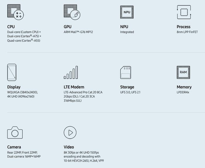 So với vi xử lý Exynos 9810 thế hệ trước đó, Exynos 9820 được thay thế 02 lõi CPU tùy chỉnh bằng 2 Cortex-75 và chip được nâng cấp lên một bước từ 10 nm đến 8 nm với mức tiêu thụ điện năng ít hơn 10%.