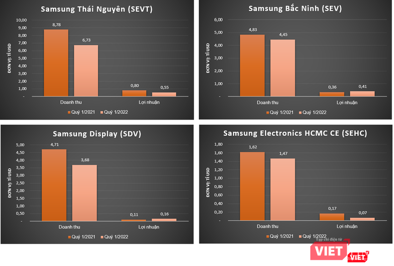 Samsung Bắc Ninh ghi nhận doanh thu quý 1/2022 đạt 4,8 tỉ USD, tăng 8,7% so với quý 1/2021. Tuy nhiên, đơn vị này lại báo lãi giảm 12,9% so với cùng kỳ năm trước, xuống mức 0,3 tỉ USD.