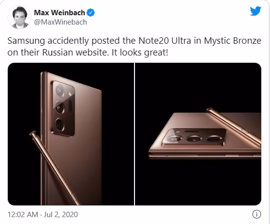 Theo chuyên gia săn tin Max Weinbach, một trong những người đầu tiên phát hiện ra “tai nạn” này của Samsung, hình ảnh trên website chính là chiếc Galaxy Note 20 Ultra. Nó được sơn màu vỏ mới gọi là Đồng huyền bí (Mystic Bronze).