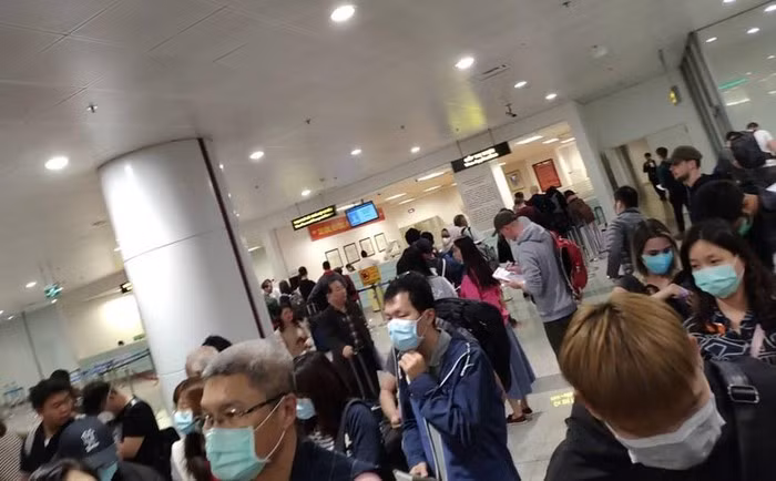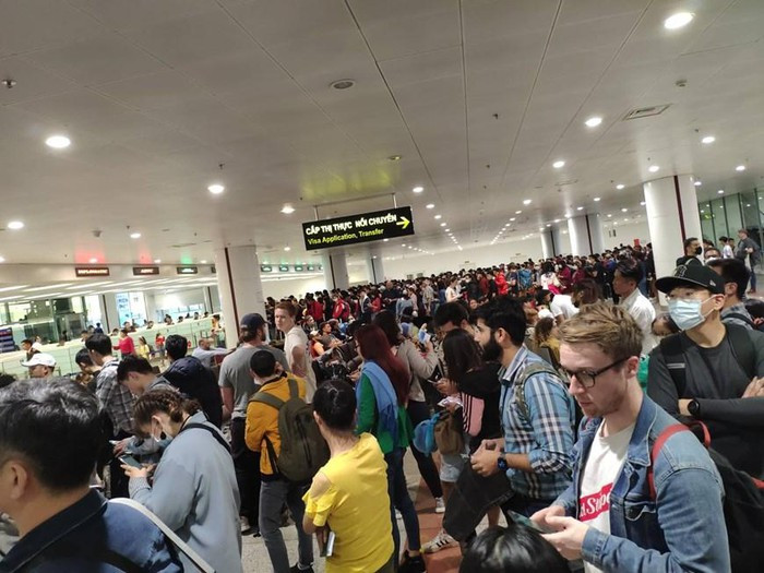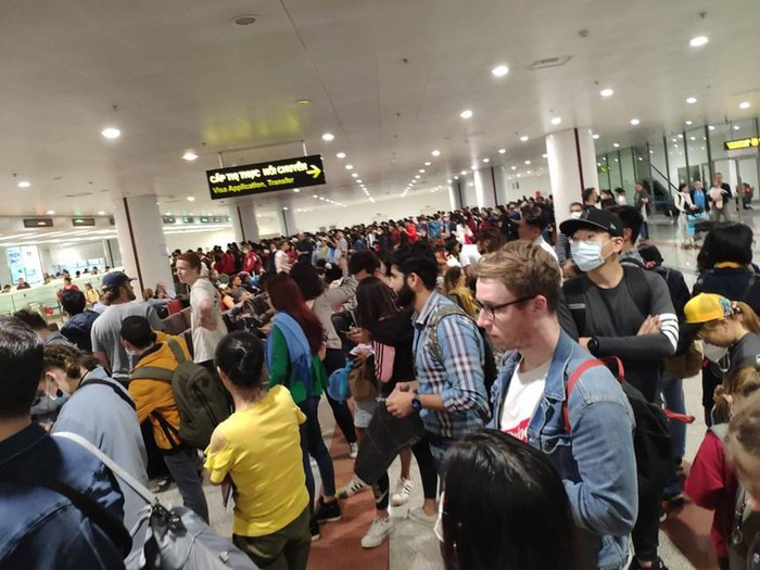 Các hành khách xếp hàng ở sân bay Nội Bài trước khi nhập cảnh. (Ảnh:Bân Đặng Long/Vietnam+)