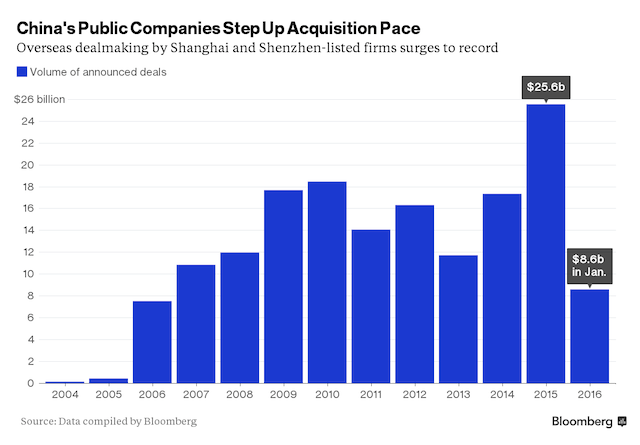 Các nhà đầu tư Trung Quốc đã liên tục rót vốn vào các doanh nghiệp nước ngoài trong năm nay. Theo Shanghaiist, từ đầu năm 2016 tới nay, đã có khoảng 66 thương vụ mua lại doanh nghiệp nước ngoài với giá trị 70 tỷ USD được công bố. Với tốc độ này, Trung Quốc có thể sớm vượt qua kỷ lục về giá trị M&A doanh nghiệp nước ngoài được nước này thiết lập năm ngoái (123 tỷ USD).