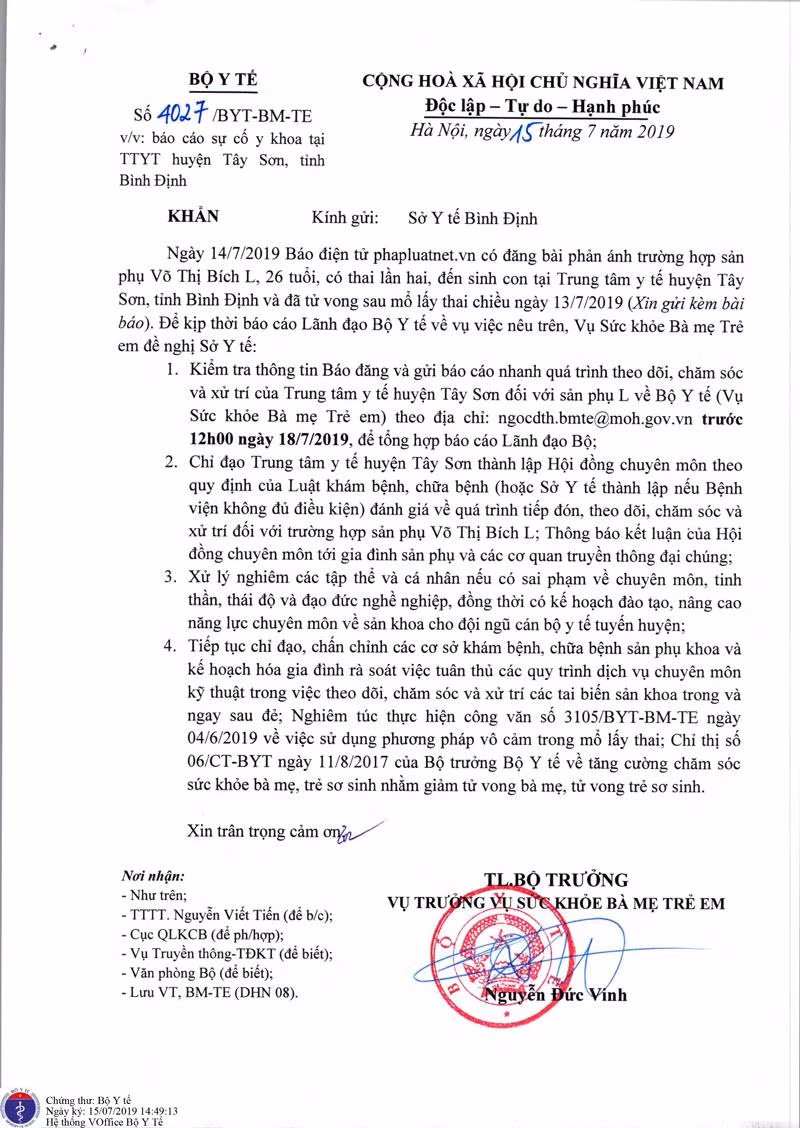 Bộ cũng yêu cầu Sở Y tế tỉnh Bình Định chỉ đạo Trung tâm Y tế huyện Tây Sơn thành lập Hội đồng chuyên môn đánh giá về quá trình tiếp đón, theo dõi, chăm sóc và xử trí đối với trường hợp của sản phụ Võ Thị Bích L.; thông báo kết luận của Hội đồng chuyên môn tới gia đình sản phụ và các cơ quan đại chúng.