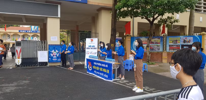 Những thí sinh đầu tiên làm xong bài ra về trong sự vỗ tay chúc mừng của đội thanh niên tình nguyện tiếp sức mùa thi