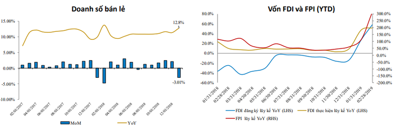 Số liệu của BVSC cho thấy doanh số bán lẻ trong tháng 2/2019 tuy có giảm 3% so với tháng 1/2019, nhưng lũy kế 2 tháng đầu năm ghi nhận tăng trưởng 12,8% so với cùng kỳ. Đây là mức tăng cao nhất kể từ tháng 3/2018, cho thấy tiêu dùng trong nước vẫn tăng trưởng tốt.
