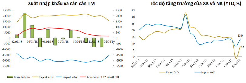 Do đó, cán cân thương mại đã chuyển sang trạng thái thâm hụt (800 triệu USD) trong 2 tháng đầu năm. Lũy kế 12 tháng gần nhất, thặng dự thương mại đang có xu hướng giảm dần.