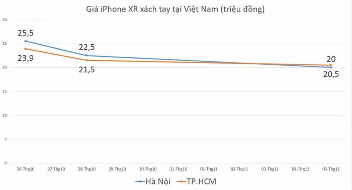 Chỉ vài ngày sau khi về Việt Nam, giá iPhone XR liên tục được các cửa hàng điều chỉnh giảm. Theo đó, tại TP.HCM, máy có giá khởi điểm từ 21,5 triệu đồng cho bản 1 SIM, bộ nhớ trong 64 GB, giảm 2,4 triệu đồng so với trước. Tại Hà Nội, nhiều cửa hàng cũng giảm giá máy còn 22,5 triệu đồng. Phiên bản 2 SIM cùng dung lượng có giá cao hơn khoảng 500.000 đồng.