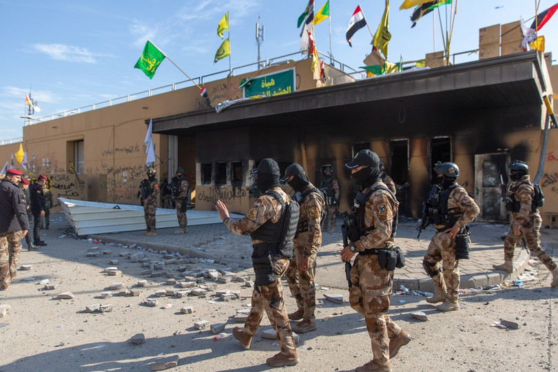 Tổng thống Trump đã tuyên bố coi Iran là người đứng phía sau cuộc tấn công vào đại sứ quán Mỹ; phía Iran đã bác bỏ lời cáo buộc này. Ông Trump đã ra lệnh đưa thêm 750 lính Mỹ đến Trung Đông và có kế hoạch gửi thêm 3.000 người nữa. Ông cảnh báo rằng Iran “sẽ phải trả giá rất nặng nề! Đây không phải là cảnh báo, mà là đe dọa”, nhưng ông Trump không nói rõ mối “đe dọa” này có nghĩa là gì. Khi được hỏi liệu cuộc khủng hoảng này có biến thành chiến tranh hay không, ông Trump trả lời rằng “đó không phải là một điều tốt cho Iran”, đồng thời nói rằng ông muốn thấy hòa bình, “Iran nên muốn hòa bình hơn bất cứ ai”. (Ảnh: AP).