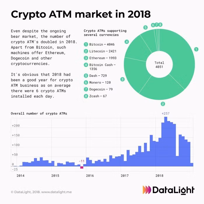Một trong những con số đáng ngạc nhiên nhất đến từ thống kê Data Light là 6 máy ATM tiền mật mã được lắp đặt trung bình mỗi ngày vào năm 2018. Một trong những thành phần chính của tích hợp và chấp nhận tiền mật mã rộng rãi hơn là sự sẵn có của tiền mật mã cho số đông đại chúng, và đó là chính xác là những gì sự tăng trưởng của ATM cho thấy.