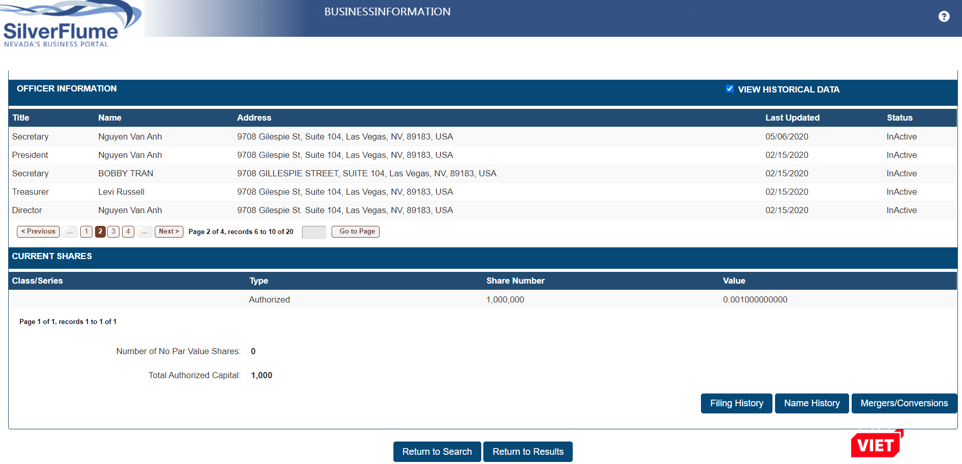 Bên cạnh đó, dữ liệu tra cứu cũng cho thấy, có một cá nhân tên Nguyen Van Anh đã đảm nhiệm cương vụ Chủ tịch HĐQT của tổ chức này từ ngày 15/2/2020, rồi sau đó đã được thay thế bởi một cá nhân khác tên Levi Russell.