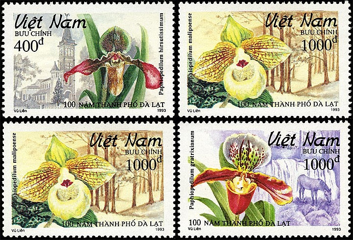 Bộ tem “Hoa phong lan (Kỷ niệm 100 năm thành phố Đà Lạt)” gồm 04 mẫu, được phát hành ngày 16/6/1993: