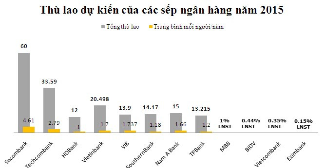 Theo kế hoạch của Sacombank, năm 2015, lợi nhuận trước thuế của ngân hàng là 3.000 tỷ đồng. Như vậy, ước tính Sacombank sẽ chi trả thù lao và chi phí cho các sếp khoảng 60 tỷ đồng.