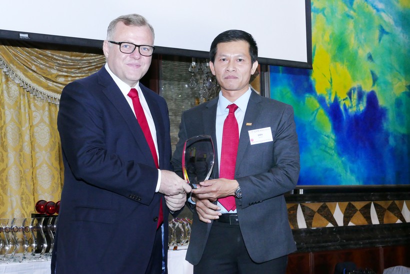 Ông Đỗ Lam Điền (phải) – GĐ Khối Ngân hàng Doanh nghiệp SHB nhận giải thưởng NH Tài trợ dự án tốt nhất và NH SME tốt nhất.