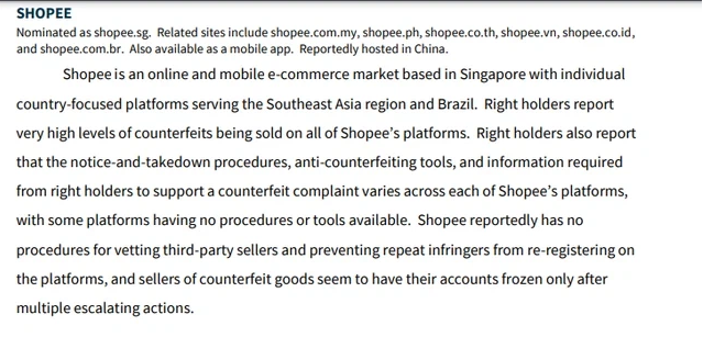 Đối với Shopee, hoạt động mua bán hàng giả mạo bán trên tất cả các nền tảng Shopee tại Đông Nam Á và Brazil hiện được bên giữ bản quyền báo cáo ở mức rất cao. Shopee bị cáo buộc không có thủ tục điều tra với bên bán hàng thứ ba.