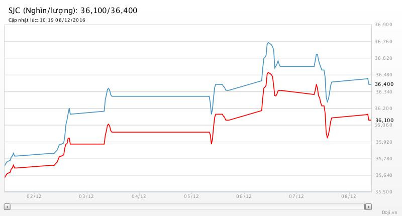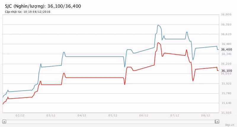 Trong khi, tại các đại lý của Doji, giá vàng miếng SJC lại được Tập đoàn này điều chỉnh giảm nhẹ 20 nghìn đồng mỗi chiều về yết ở 36,10 – 36,40 triệu đồng/lượng (MV-BR) đối với giao dịch lẻ; và đắt hơn 10 nghìn đồng chiều mua, đồng thời rẻ hơn 10 nghìn đồng chiều bán đối với giao dịch buôn ở thị trường Hà Nội. Hiện, doãng chênh lệch 2 chiều mua - bán ở Doji là 300 nghìn đồng/lượng.