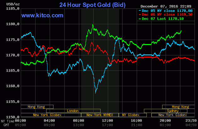 Chốt phiên giao dịch Thứ Tư (ngày 7/12), giá vàng giao Tháng Hai trên sàn Comex tại Sở giao dịch New York Mercantile đảo chiều tăng mạnh $7,40 (+0,6%) lên đóng cửa ở $1.177,50/oz. Tương tự, giá bạc giao Tháng Ba cũng leo 46,5 cents (+2,8%) lên chốt ở $17,275/oz.
