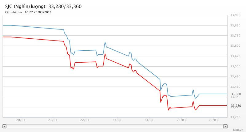 Tương tự, tại các đại lý Doji, giá vàng miếng SJC cũng được Tập đoàn giữ nguyên ở mức 33,28 – 33,36 triệu đồng/lượng (MV-BR) đối với giao dịch lẻ; và đắt hơn 10 nghìn đồng chiều mua, đồng thời rẻ hơn 10 nghìn đồng chiều bán đối với giao dịch buôn ở thị trường Hà Nội. Với biểu giá này, doãng chênh lệch 2 chiều mua – bán vàng SJC tại Doji vẫn là 80 nghìn đồng/lượng.