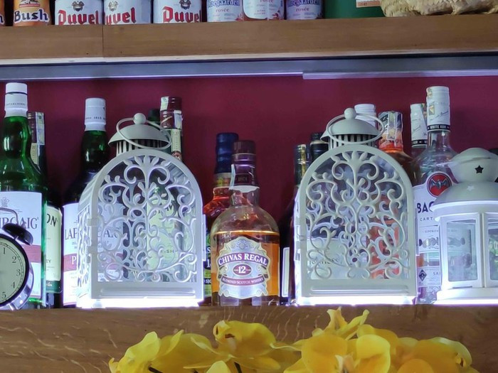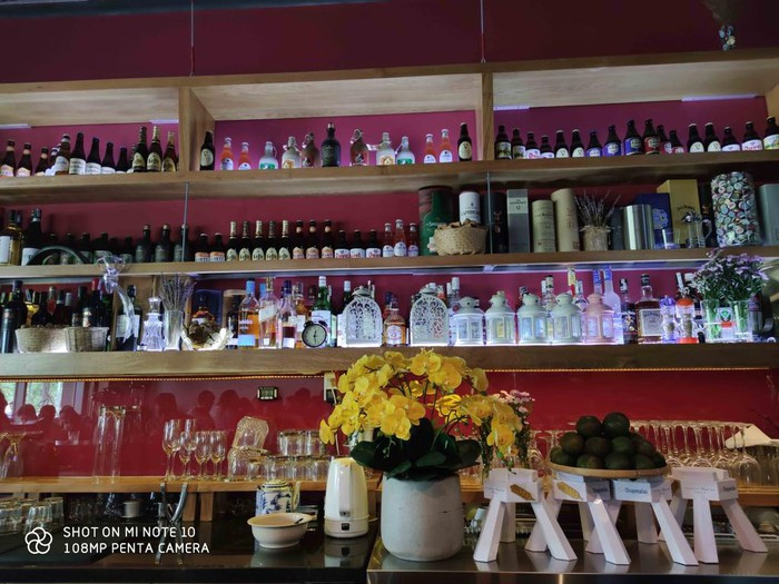 Ảnh chụp từ chế độ 108 MP có chi tiết cao. Kể cả ảnh gốc (trái) lẫn ảnh được zoom 50% (phải), những chi tiết nhỏ đều hiển thị sắc nét, không bị noise, người dùng vẫn có thể đọc được những dòng chữ trên chai rượu khi phóng to.