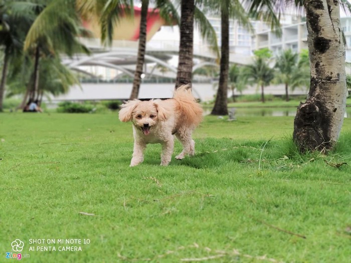 Ngoài ra, Mi Note 10 có chế độ chụp chân dung, người dùng có thể điều chỉnh khẩu độ từ f/1.0 đến f/16. Trong ảnh, chú chó được làm nổi bật, vùng chuyển xóa phông phía sau khá tự nhiên, không có tình trạng lem nhem. Màu cỏ có phần rực hơn so với thực tế.