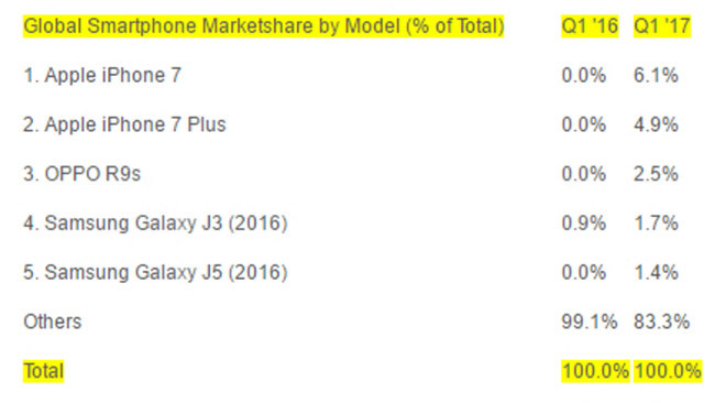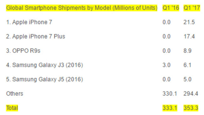 Từ bảng thống kê dưới đây chúng ta có thể thấy, chiếc điện thoại bán chạy nhất quý I/2017 chính là chiếc iPhone 7 của Apple, với 21,5 triệu chiếc, theo sau là iPhone 7 Plus (17,4 triệu chiếc).