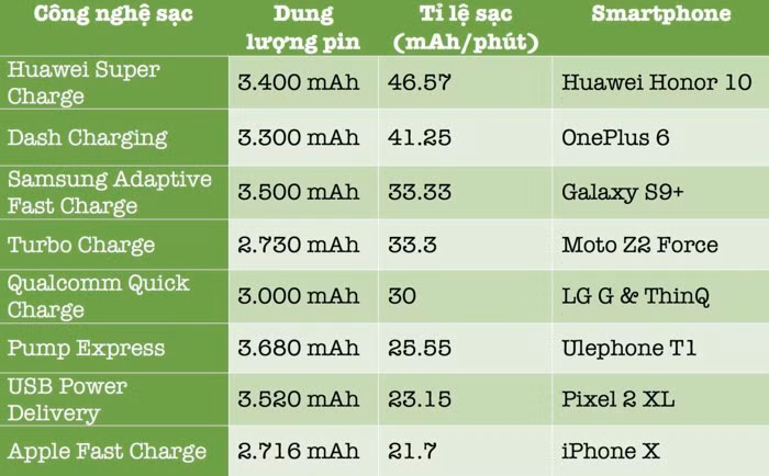 Kết quả thử nghiệm cho thấy, Huawei Honor 10 là chiếc smartphone có tốc độ sạc nhanh nhất hiện nay (công nghệ Huawei Super Charge) và nhanh hơn gấp đôi so với iPhone X (Apple Fast Charge). Vị trí thứ hai thuộc về OnePlus 6, Galaxy S9+, LG Thin Q, Pixel 2 XL…