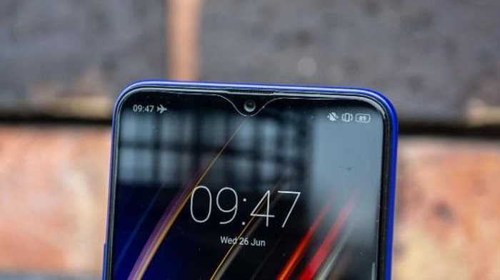 Mặt trước Realme 3 Pro gần như toàn bộ là màn hình với phần viền ở các cạnh tương đối mỏng, điều này chủ yếu do máy sử dụng thiết kế màn hình giọt nước – nơi đặt camera selfie và tai nghe. Nhờ thiết kế này mà tỷ lệ màn hình so với thân máy chiếm tới 90,3%.