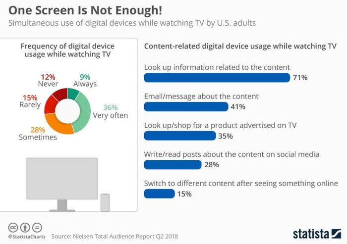 Theo khảo sát của Neilsen Total Audience, quý II/2018, có 9% người tham gia trả lời họ luôn luôn sử dụng smartphone khi xem TV, 36% trả lời rất thường xuyên và 28% trả lời thỉnh thoảng.