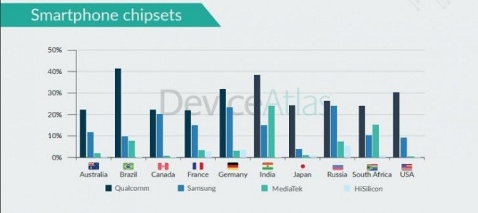 Trong thế giới Android quý 2, vi xử lý của Qualcomm khá đông đảo. Tỉ lệ máy dùng MediaTek có phần cao hơn (trên 10%) tại các quốc gia đang phát triển như Ấn Độ, Ai Cập và Colombia, thậm chí tại Đài Loan tỷ lệ máy Android dùng vi xử lý MediaTek chiếm đến 35%.