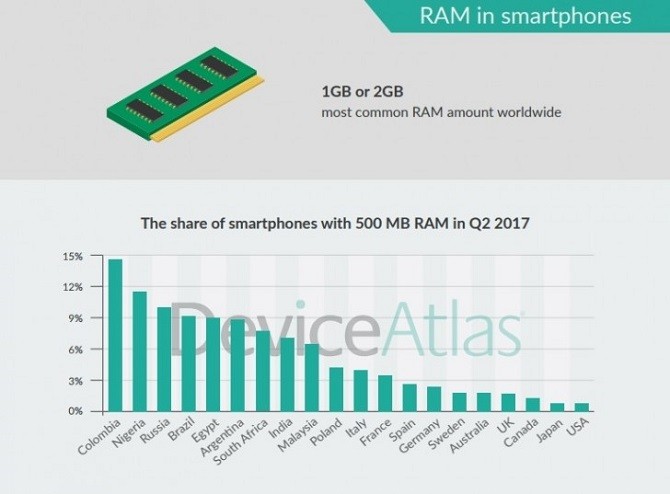 Một thống kê khác khá thú vị là về dung lượng RAM. Dù smartphone hiện nay đã có 8GB RAM nhưng thiết bị có RAM chỉ 512MB (500MB) vẫn còn khá phổ biến tại Colombia, Nigeria, Nga, Brazil, Ai Cập và Argentina.