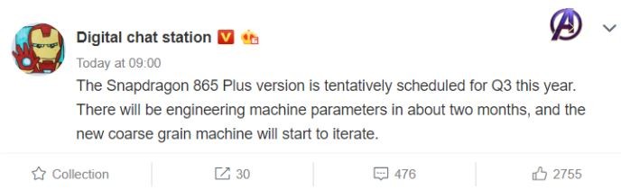 | Nhiều khả năng Snapdragon 865+ sẽ được cho ra mắt trong quý 3 năm nay (Ảnh: Weibo) |